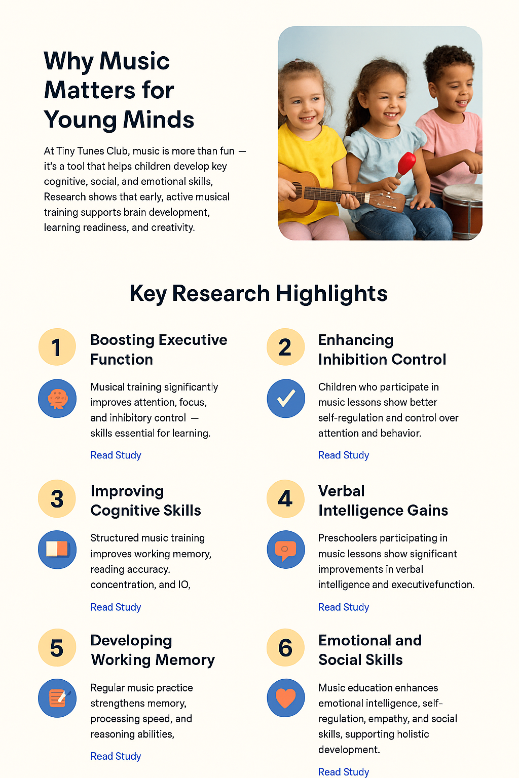 Tiny Tunes Club brings lively music sessions right into your daycare, where small groups of six children explore rhythm, melody, and instruments to grow confidence and focus while having fun.